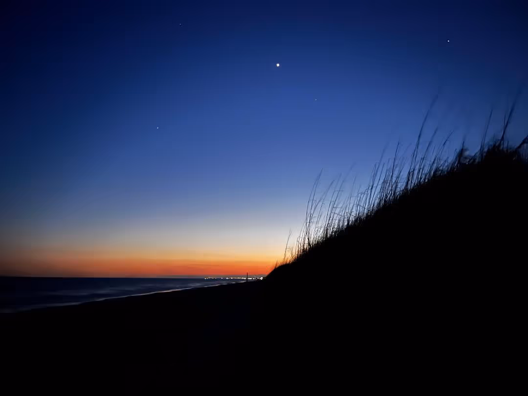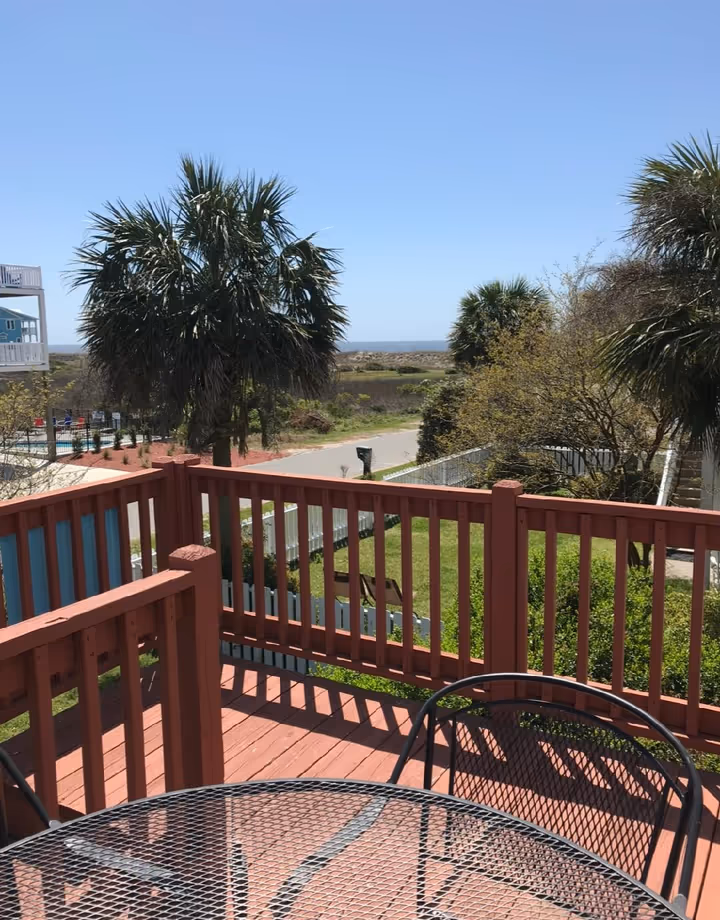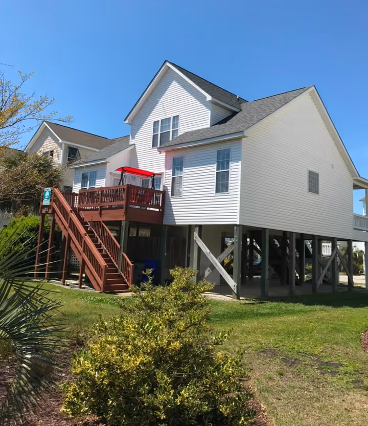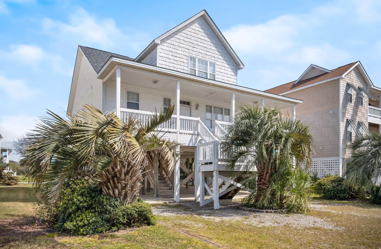 Situated on pilings, the home offers panoramic views of the ocean at both sunrise and sunset with just a short 1/4 mile walk to the Oak Island Pier. Covered front porch with rocking chairs and back deck with seating. You can choose the sunny or shady side of the house, both with ocean views while you hear the waves breaking. Extra-large enclosed outdoor shower with hot and cold water.