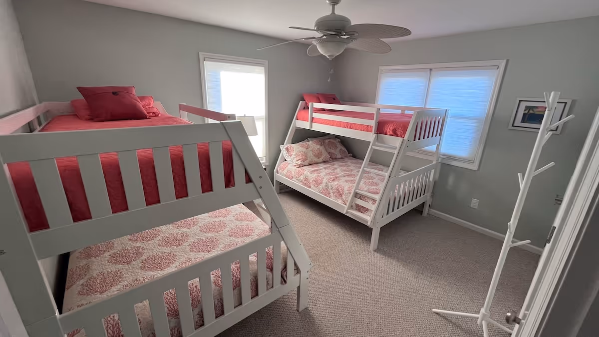 The second-floor features two additional bedrooms and a newly renovated bathroom. The primary bedroom includes a comfy king-sized bed featuring new bedroom furniture for 2024 as well as a Smart TV. The secondary bedroom features two brand new wooden twin-over-full bunk beds.