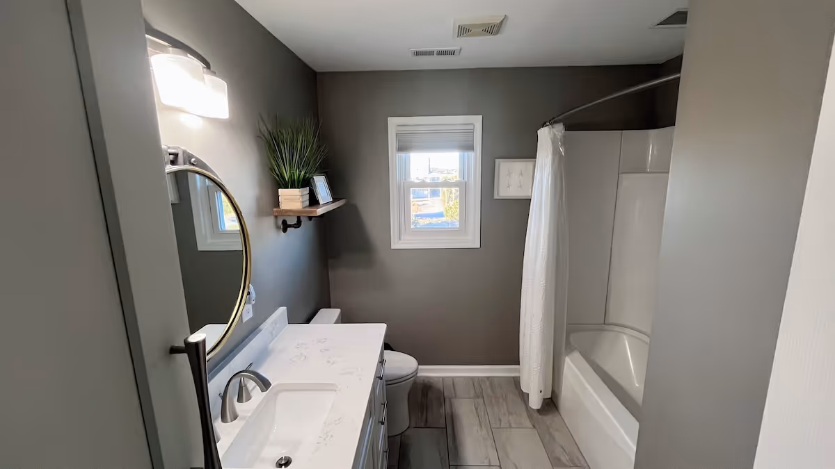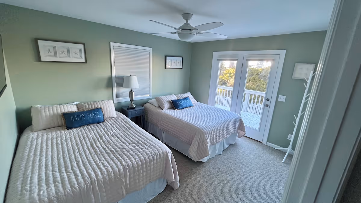 The first floor offers a newly renovated bathroom with full tub/shower and two bedrooms. The primary bedroom features a comfy king-sized bed with brand new furnishings for 2024 while the secondary bedroom offers two plush queen beds.